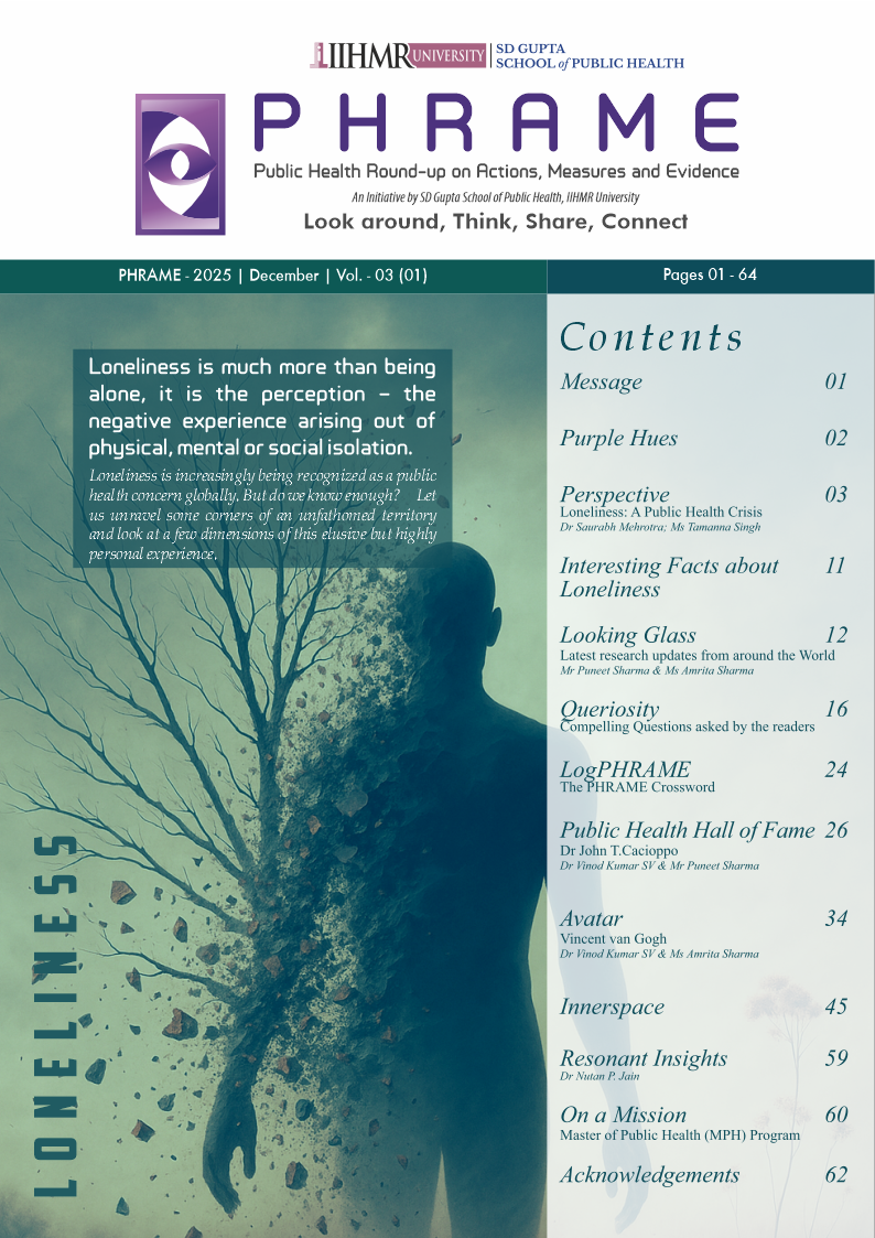 Phrame is a quarterly periodical initiated by SD Gupta School of Public Health. PHRAME (Public Health Round-up on Actions, Measures and Evidence) has been envisioned to bring latest updates and research from around the globe on areas of Public health importance. It will also serve as a platform for popularizing public health, through engaging and interactive content featuring innovations, trivia and puzzles!