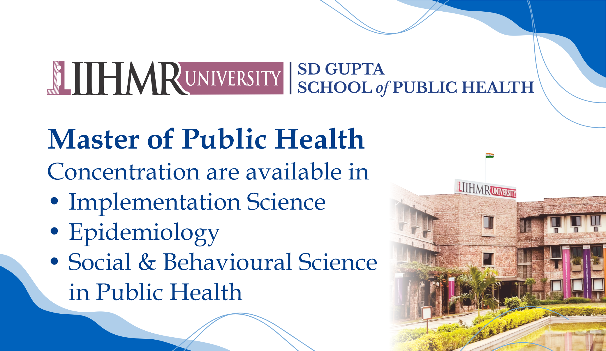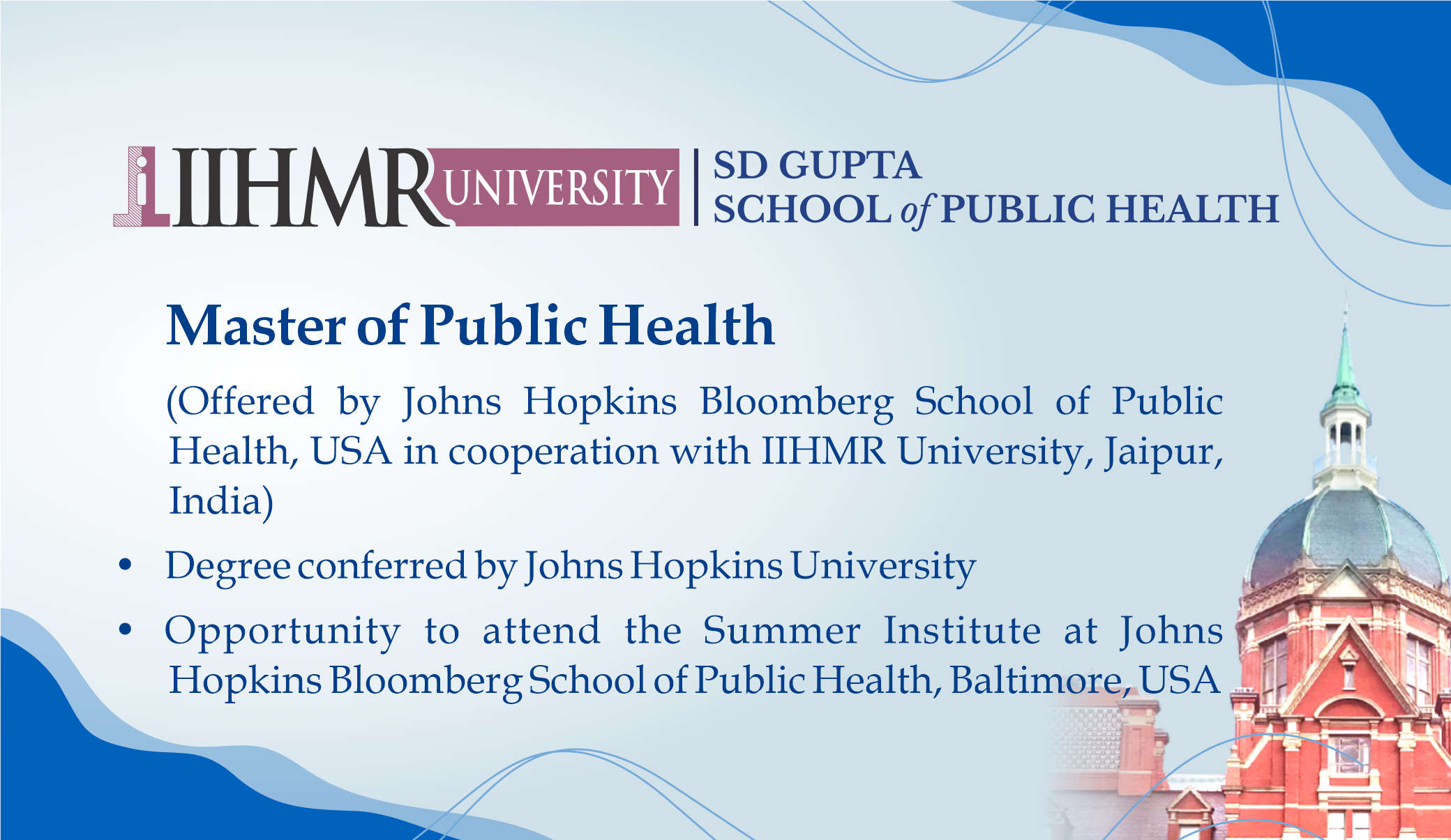 - Master of Public Health (Offered by Johns Hopkins Bloomberg School of Public Health, USA in cooperation with IIHMR University, Jaipur, India)
